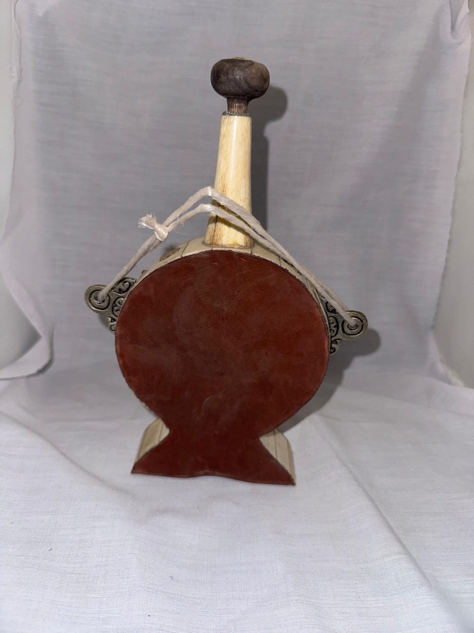 This is an exquisite piece of Moroccan artisanal craft, a decorative flask that showcases a beautiful combination of natural materials and intricate artistry. The entire flask is meticulously constructed from panels of polished camel bone, which have been hand-drawn with fine, traditional Berber scrollwork patterns in black and red ink. The design is further embellished with ornate, repoussé silver-toned metal appliqués, including a striking central rosette set with a single, precious red bead. With its classic round shape, integrated pedestal base, and original wooden stopper, this flask is a stunning example of Saharan folk art. It is a perfect decorative piece for a collector or for anyone looking to add a touch of authentic, handcrafted elegance to their home.