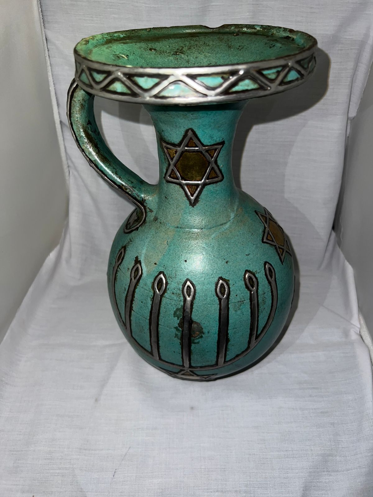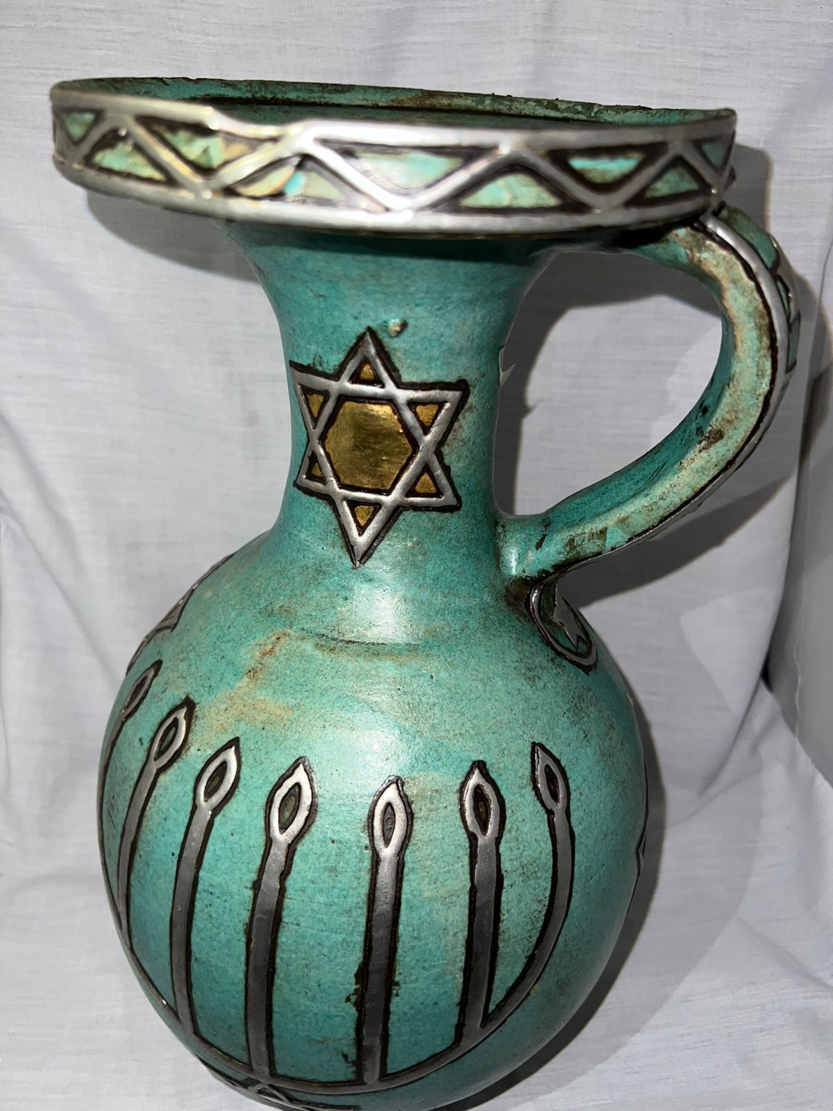 This beautiful handcrafted ceramic jug features a striking turquoise glaze accented with silver detailing and a central Star of David motif with a gold-tone inlay. The jug’s rounded body is decorated with vertical engraved flame-like designs, while the rim and handle are adorned with intricate silver geometric patterns, adding to its artistic appeal.