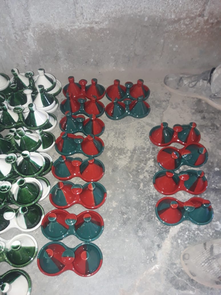 This is a charming and highly practical piece of traditional Moroccan serveware, cleverly designed for presenting a pair of complementary spices or condiments. Handcrafted by skilled artisans from ceramic (mud), this single piece features two small, fused bowls in a graceful figure-eight shape, complete with two individual conical lids. The vibrant, high-gloss glaze is applied in a variety of striking color combinations, such as the classic Moroccan red and green, or modern half-dipped styles. This double tagine is an essential and stylish accessory for any dining table, perfect for serving salt and pepper, cumin and paprika, or two different types of dips like harissa and chermoula. It’s a wonderful way to bring a touch of authentic Moroccan hospitality to your meals.