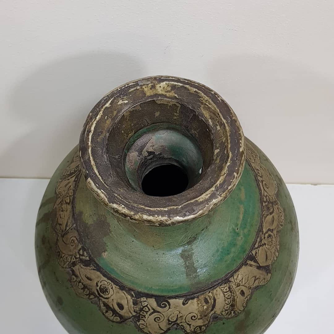 This large, artisanal vase is a stunning example of rustic elegance and traditional Moroccan craftsmanship. The substantial body is crafted from pottery with a unique, textured finish and glazed in a deep, earthy green that evokes a sense of timeless history. The vase is beautifully contrasted with hand-worked, aged brass accents at the base, shoulder, and rim. The decorative metal band around the shoulder features an ornate, scalloped design, adding a touch of antique sophistication. Due to its handmade nature, each vase possesses unique characteristics and imperfections that enhance its authentic, vintage charm. This piece is perfect as a statement floor vase for dried botanicals or pampas grass, or as a standalone decorative object on a console or entryway table.