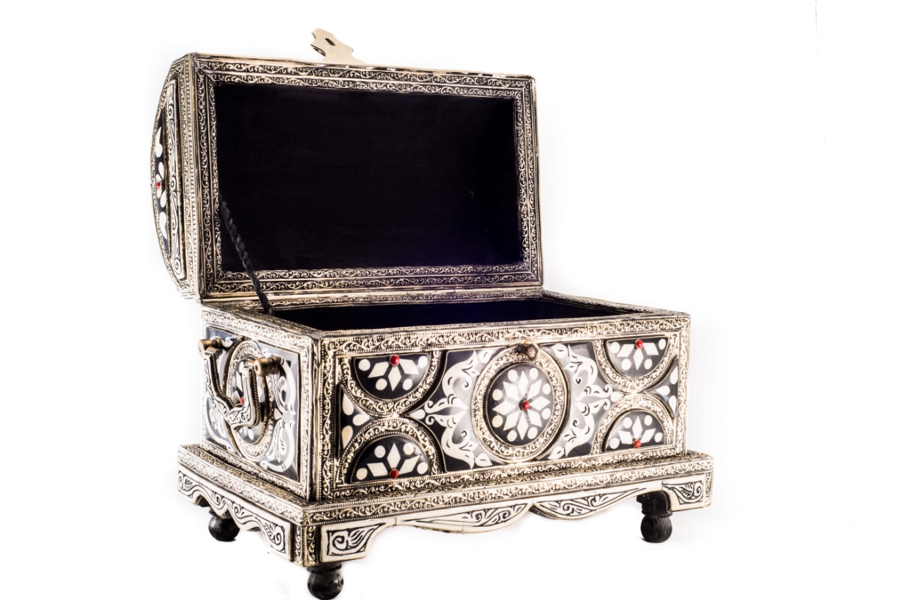 An exquisite handcrafted jewelry box featuring intricate mother of pearl inlay work in traditional geometric and floral patterns. The exterior showcases stunning mosaic designs with white pearl inlays set against dark wood, accented with delicate metallic borders and red coral-like details. The spacious interior is lined with luxurious black velvet to protect your precious jewelry and valuables. This elegant piece sits on decorative carved feet and features a secure hinged lid, making it both a functional storage solution and a beautiful decorative centerpiece.