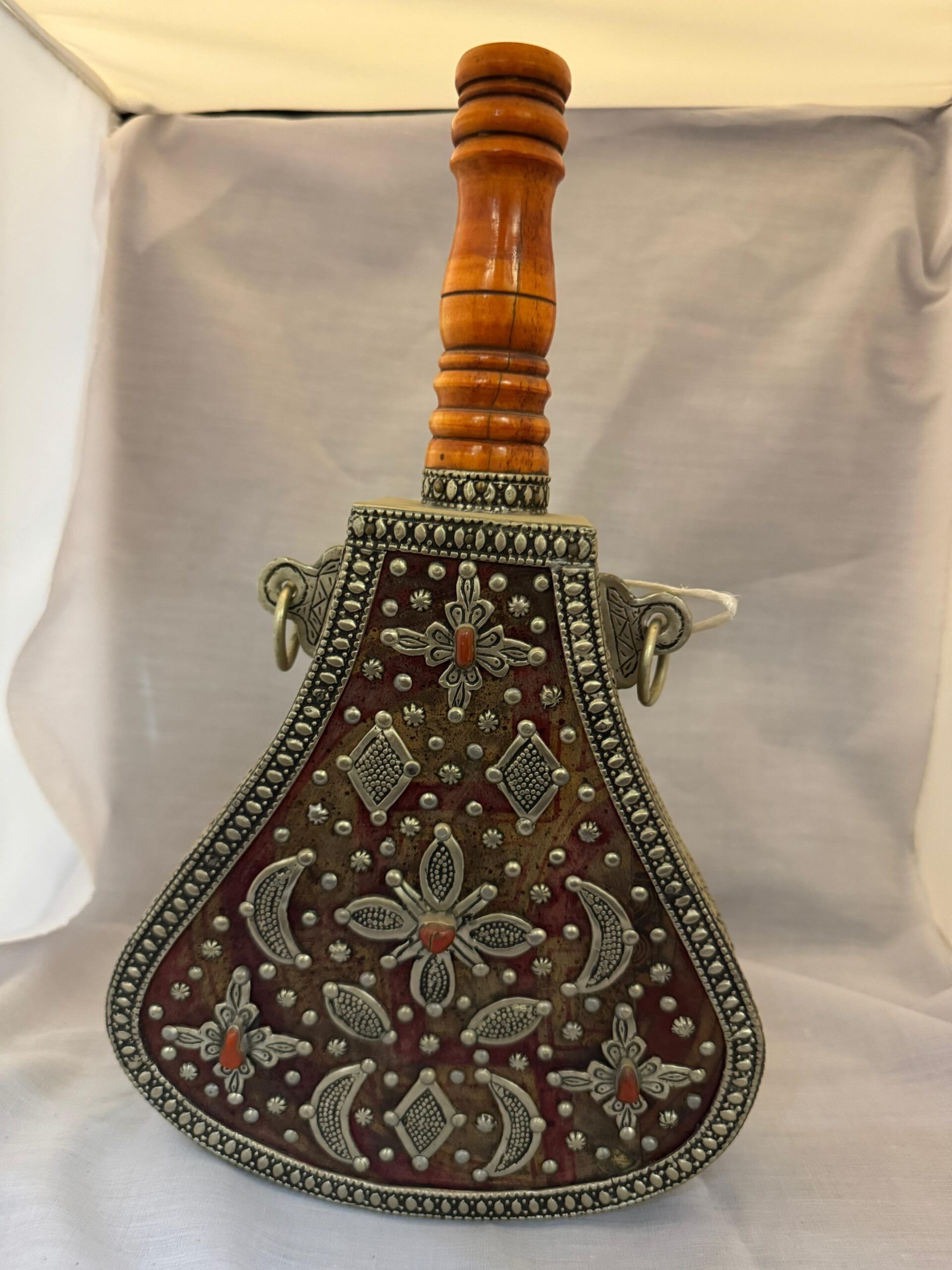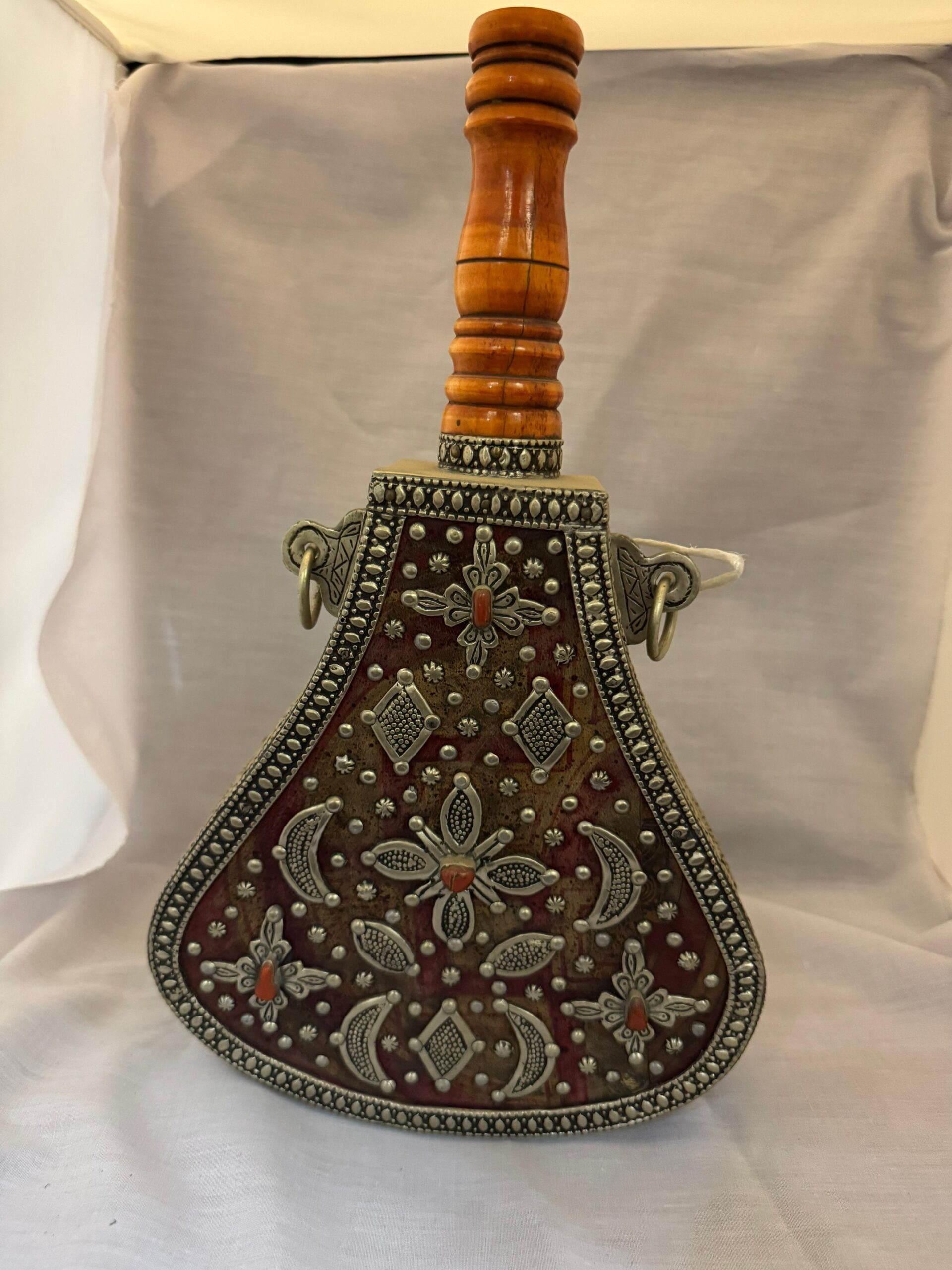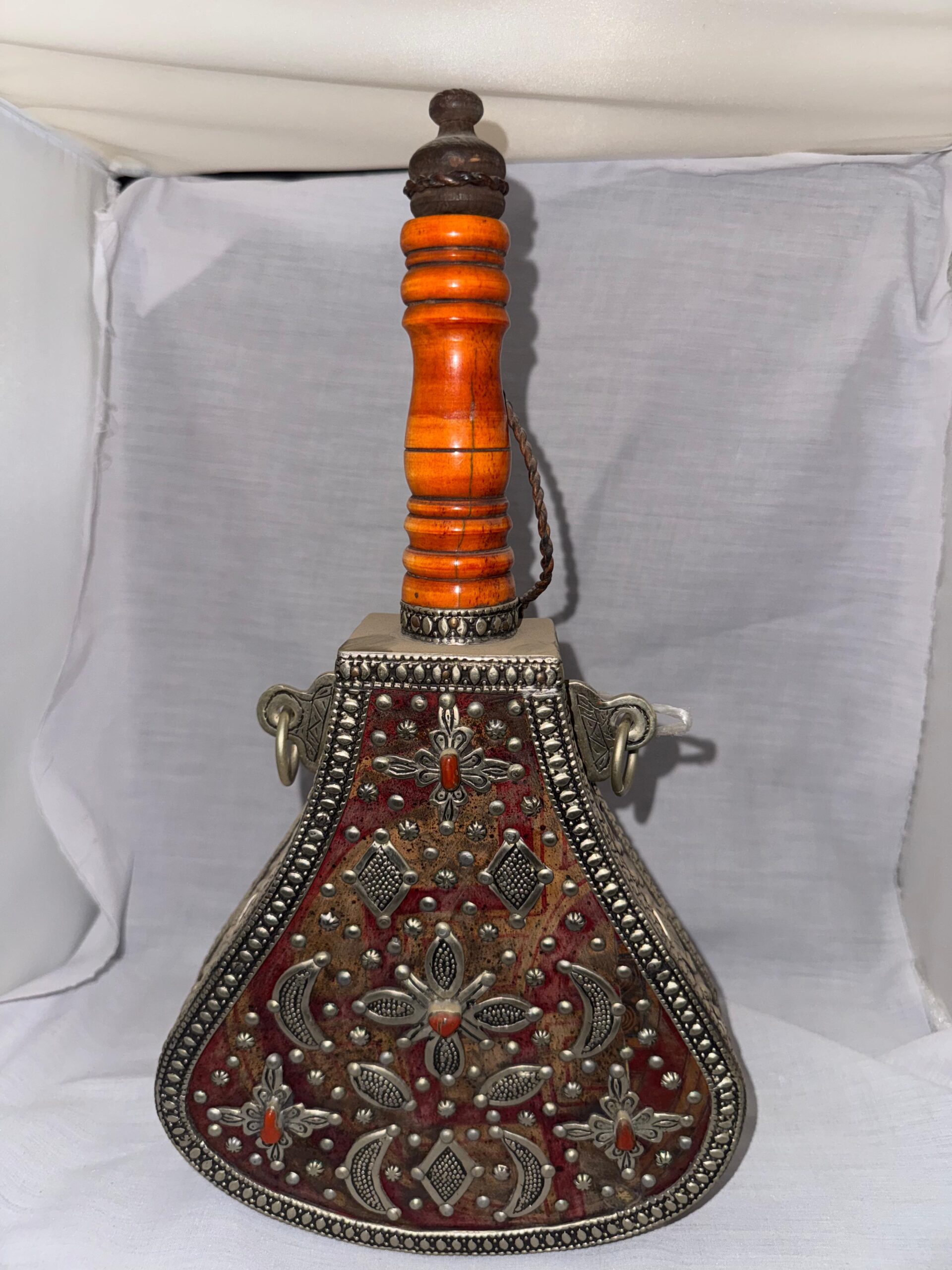 This is an authentic and highly decorative vintage Moroccan gunpowder flask, known traditionally as a baroud. An essential accessory for horsemen in historical Fantasia performances, these flasks are now treasured as unique works of tribal art. This piece is handcrafted with a leather-covered wooden body and features one side lavishly adorned with intricate, silver-toned metalwork. The detailed appliqués include floral rosettes, crescent moons, and geometric patterns, all highlighted with small, precious inlays of red coral. The flask is topped with a beautifully turned wood and bone nozzle and retains its original stopper. A stunning collector’s item, this baroud is a powerful piece of wall decor that evokes the rich history and equestrian traditions of Morocco.