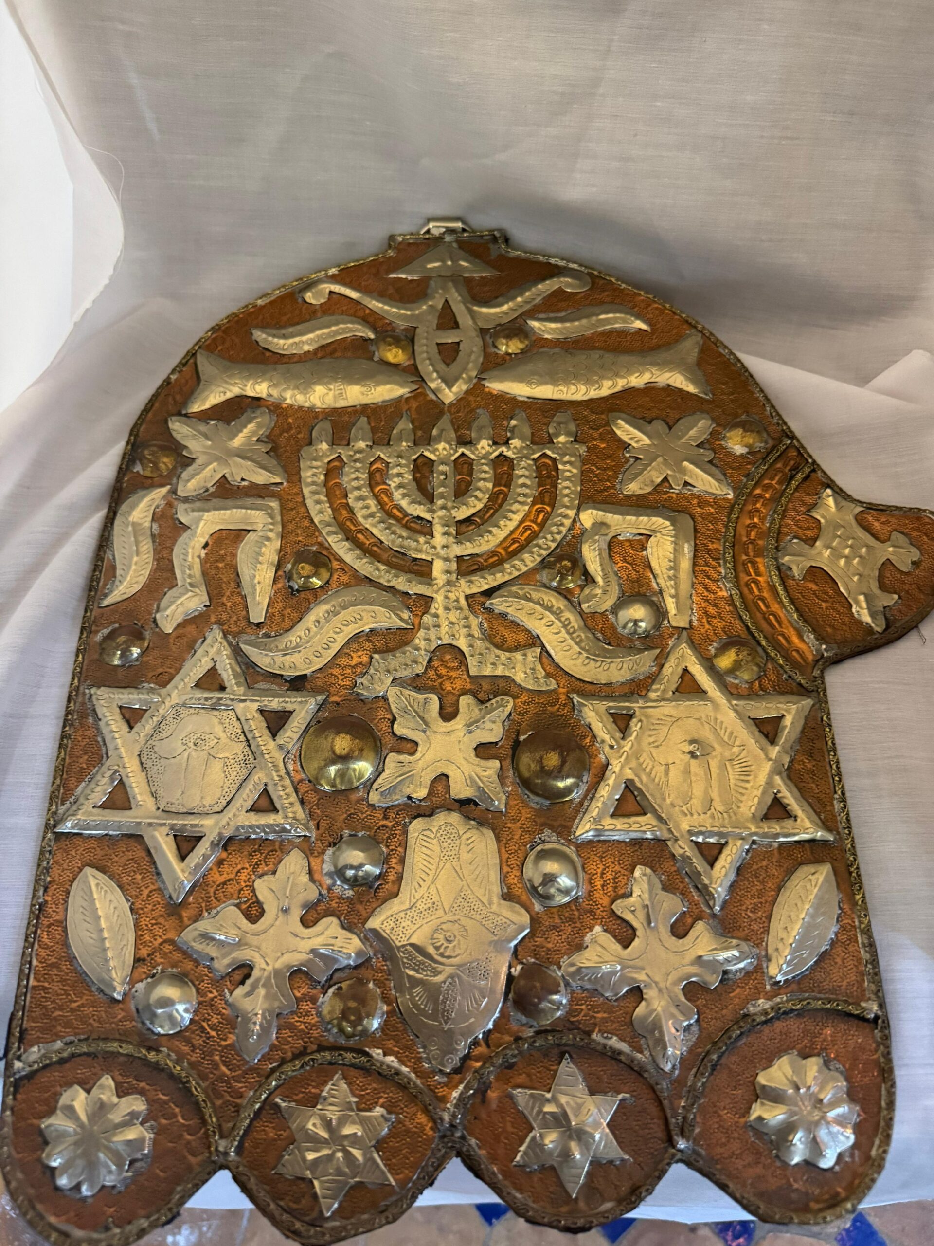 This is a powerful and extraordinary piece of vintage Moroccan Judaica folk art. The large Hamsa hand, a traditional symbol of protection, is crafted from a base of hand-hammered copper, providing a warm and textured background. The surface is lavishly adorned with a rich collage of hand-worked, silver-toned metal appliqués, each representing a significant symbol of Jewish faith and culture. A large Menorah sits at the heart of the piece, flanked by two prominent Stars of David, fish for abundance, Hebrew letters, and even a smaller Hamsa for layered blessing. The rustic, expressive craftsmanship gives this wall plaque a profound sense of history and spiritual significance. It is a stunning and meaningful amulet for the home and a remarkable collector’s item.